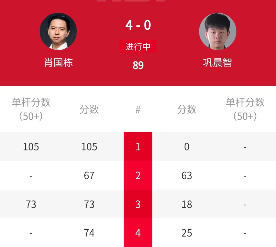 第一轮,肖国栋迎来一场中国德比战,他的敌手是经验赛选手巩晨智。他在经验赛的敌手是常冰玉。这场德比战中,小将巩晨智打出两杆50+,总比分4-2降服常冰玉。比赛第一局,常冰玉开局最初发力,他打出单杆77分,105-20先胜一局,1-0特出。