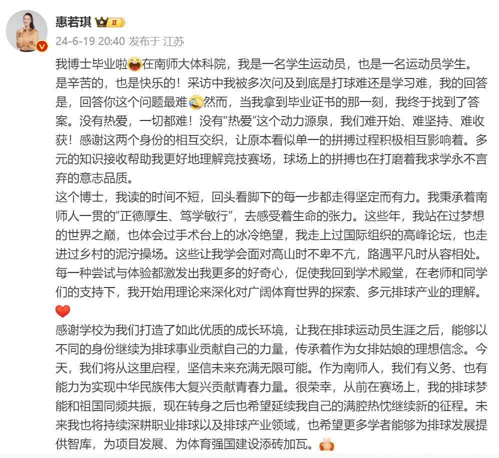 北京本领6月19日音信,中国女排奥运冠军惠若琪文牍毕业喜信。她写谈:“我博士毕业啦。这个博士,我读的本领不短,回头看眼下的每一步齐走得刚硬而有劲。”