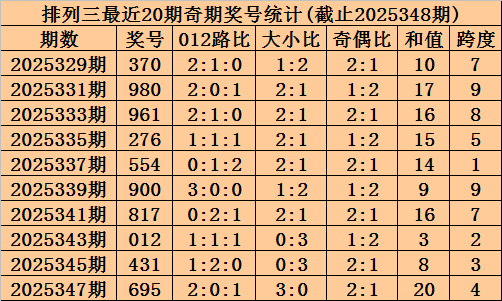 上期回归:成列三2025348期奖号为373,奇偶比为3:0,大小比为1:2,跨度为13。