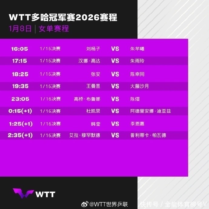 北京技术1月8日音信,2026年WTT多哈冠军赛连接进行,CCTV5直播比赛实况。女子单打1/16决赛第二个比赛日,共有王曼昱、陈幸同、陈熠三名女将出战。其中,1号种子王曼昱与日本选手大藤沙月的比赛备受和顺(19:35),经常阐扬晋级不难。