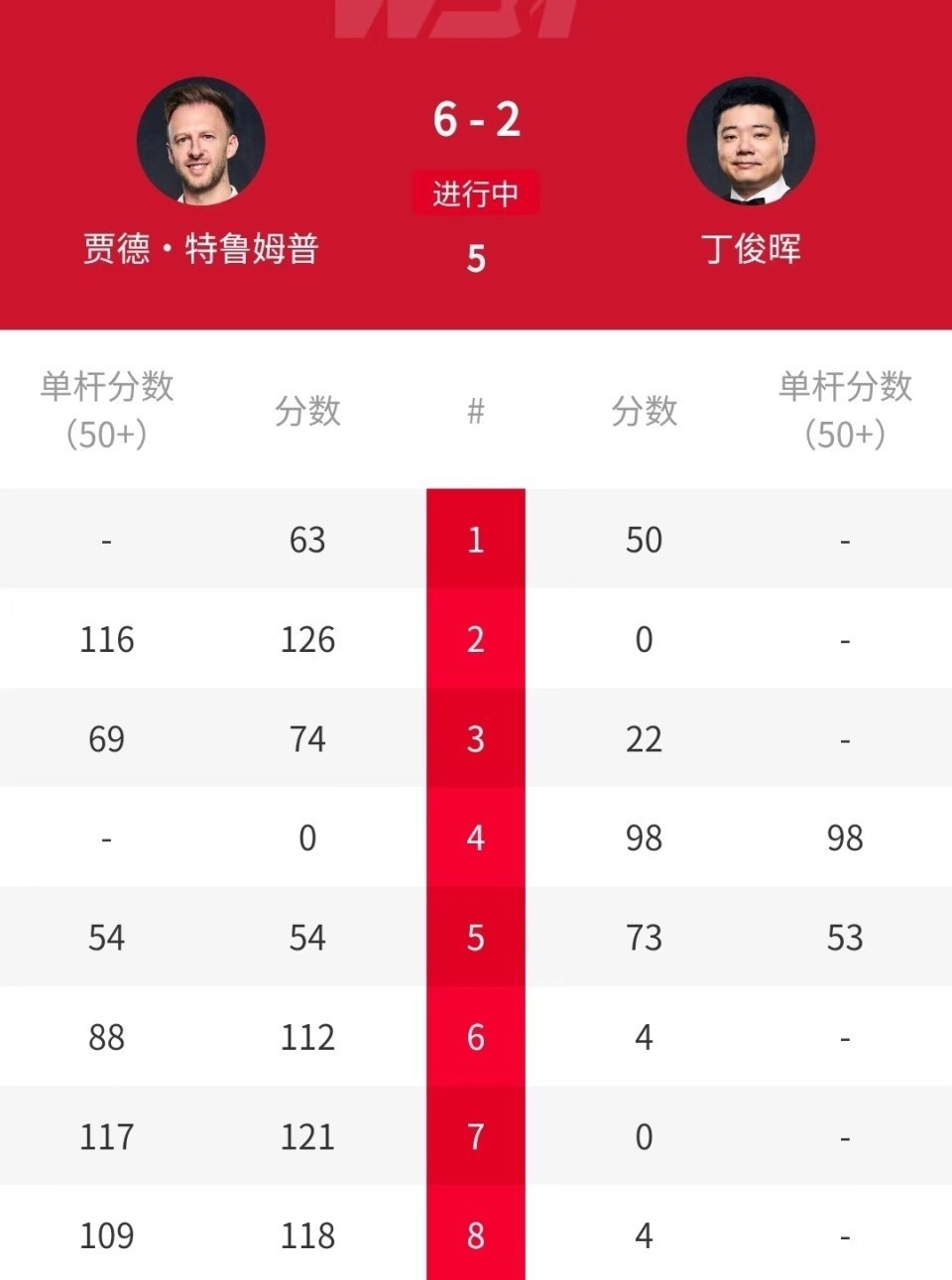 缺憾的是,上述情况莫得发生。比赛第一局,特鲁姆普先拔头筹。接下来的两局比赛,特鲁姆普轰出一杆破百和一杆50+,连胜两局之后,比分上风扩大到3-0。丁俊晖随后回敬两杆50+,连扳两局将比分追成2-3。