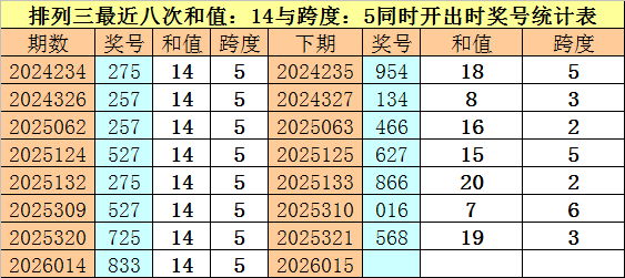 开奖讲求:体彩陈列三第2026014期奖号为:833。和值为:14,跨度为:5。